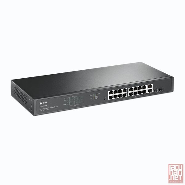 TP-Link TL-SG1218MP, 16 gigabit PoE+ RJ45 ports, 2 gigabit non-PoE RJ45 ports, and 2 combo gigabit SFP slots